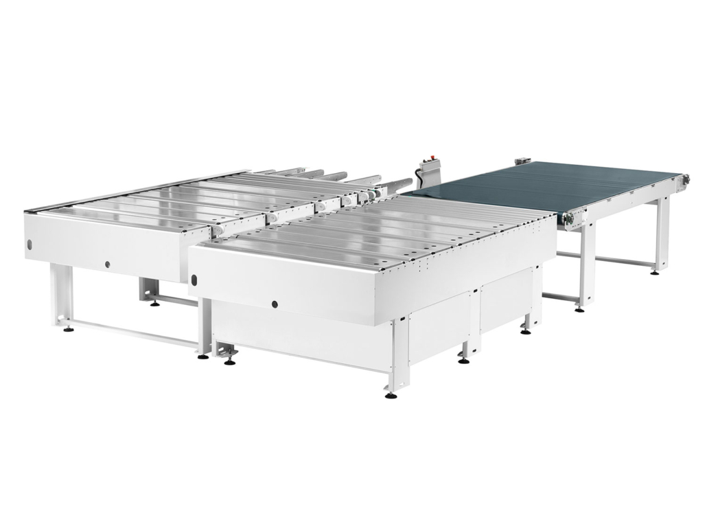 Each arm has a motorized belt to transport the workpiece into the roller conveyor.